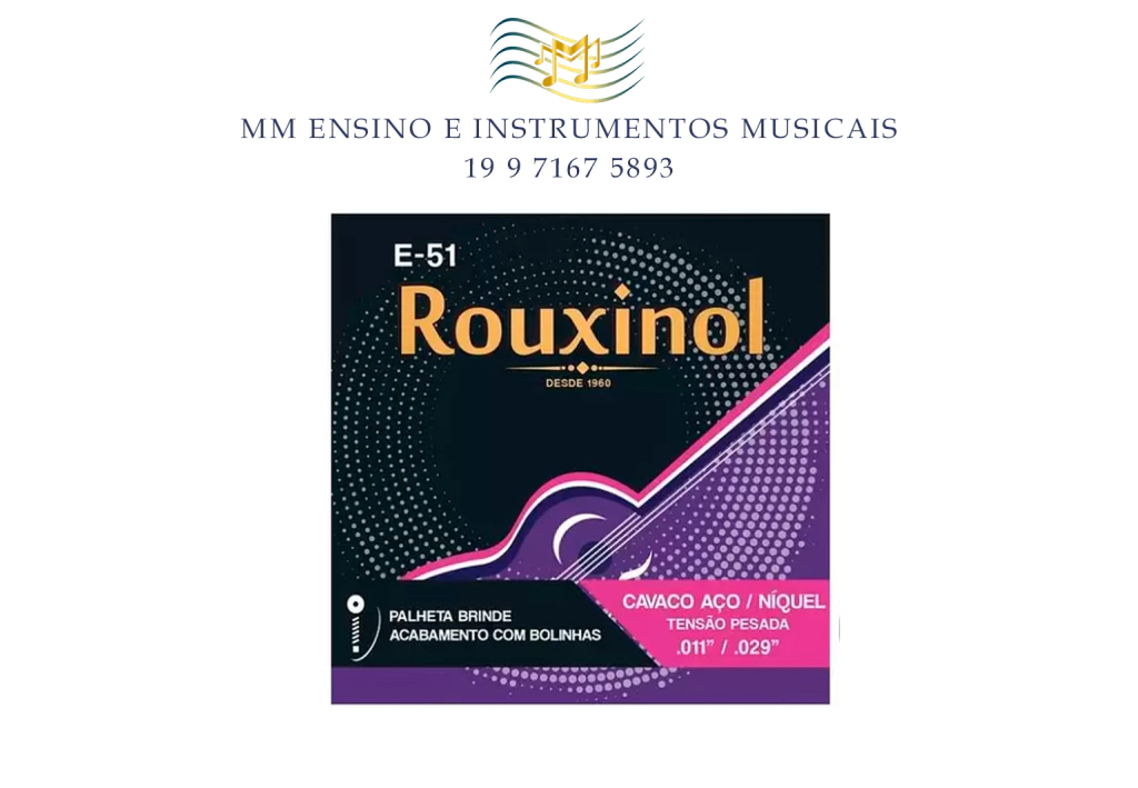 Descrição Do ProdutoEncordoamento Cavaquinho Elétrico Acústico Rouxinol E51 0.11" PRE51LEncordoamento Inox Cavaquinho com Bolinha .011.028 Rouxinol CaracterísticaUso: MusicalBase: Aço inoxidávelRestrições/Riscos: Este produto não deve ser manuseado por crianças.Durabilidade: IndeterminadaEspecificações TécnicasComposição da Embalagem: 1 encordoamento para cavaco inox com bolinhaGarantia da loja: 7 diasFabricado por: Indústria e Comércio Rouxinol LtdaOrigem